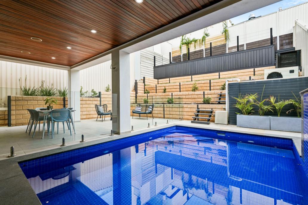 • Café-style doors opening to outdoor entertaining area and solar-heated pool